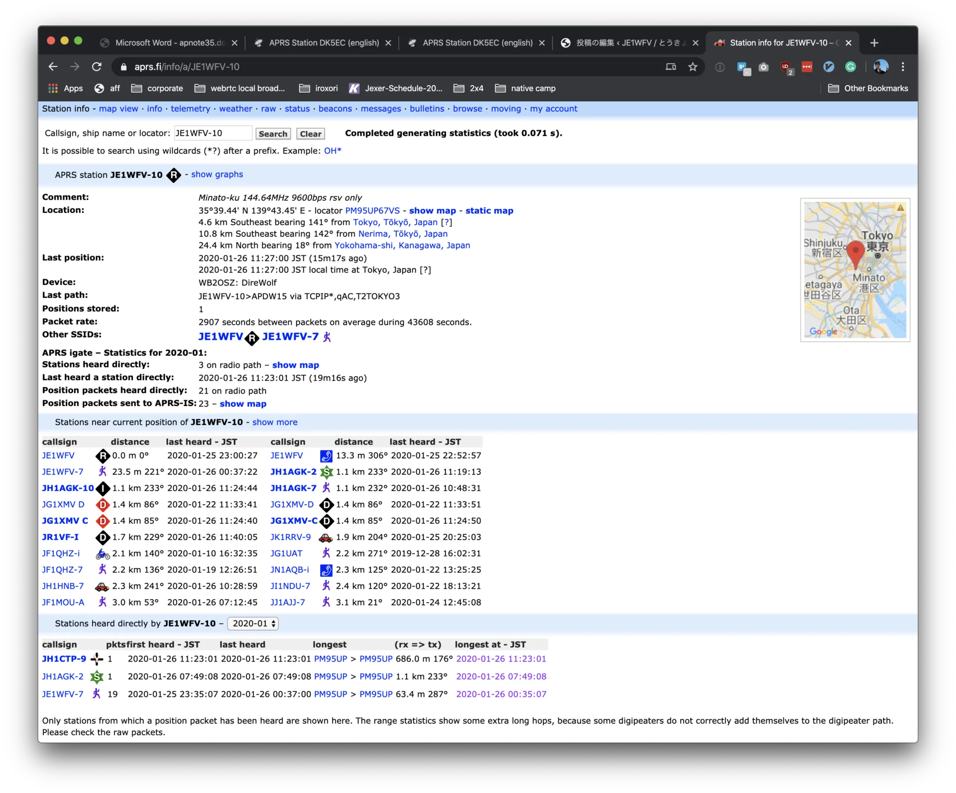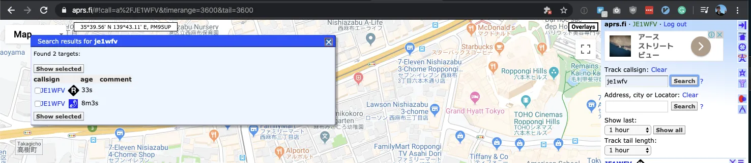 aprs.fi上でも自分の局が表示されます。APRS.fiのJE1WFV-10のページ。